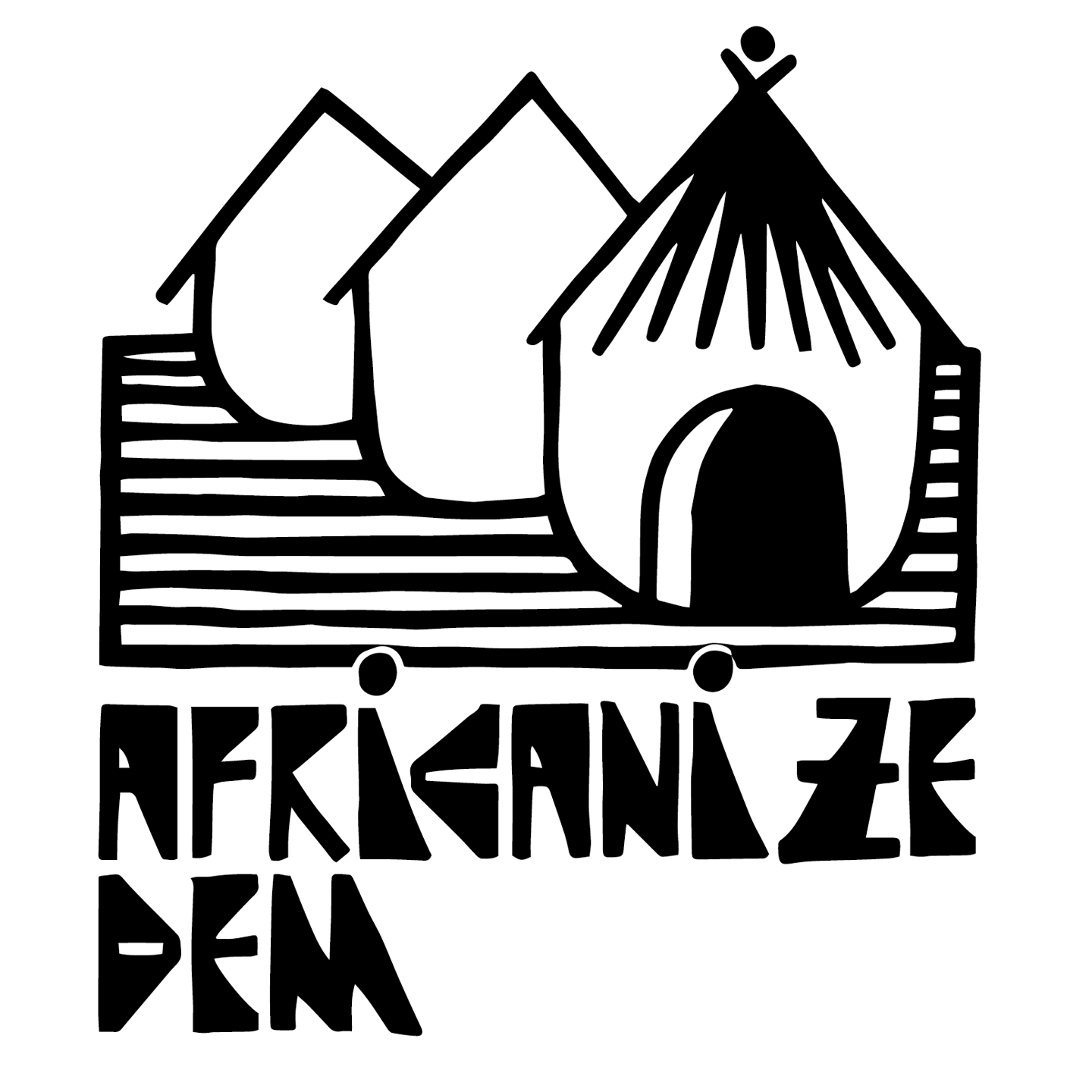 The logo features three stacked African round huts, symbolizing the three co-founders and their connection to African culture. The huts, set on a stripped ground, represent authenticity, unity, and the earthy roots of African traditions.