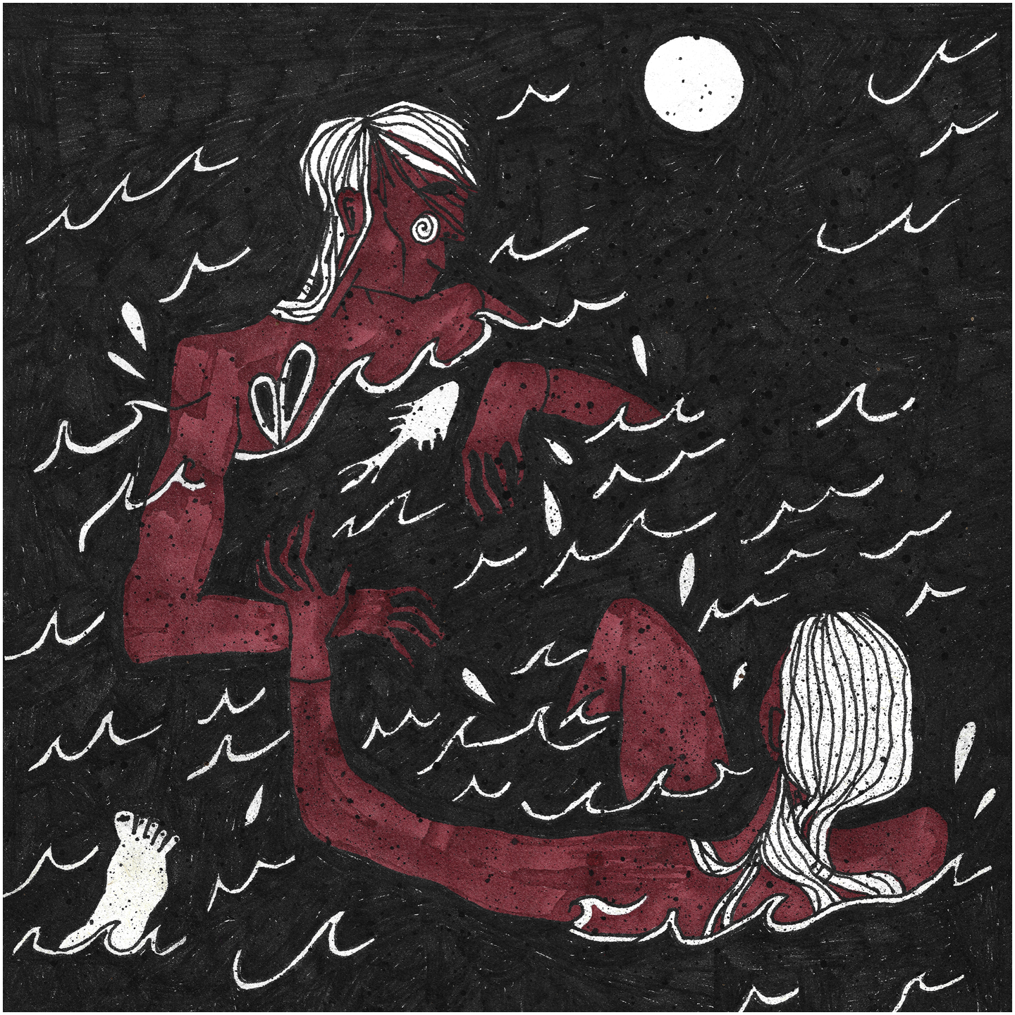 Drowning in Bordeaux, a couple floats in a black sea, their limbs tangled in wine-dark intimacy. The moon light chest is full, and a stray foot reaches the surface. This is love as a controlled drown, the fish in his chest either a parasite or a prayer.