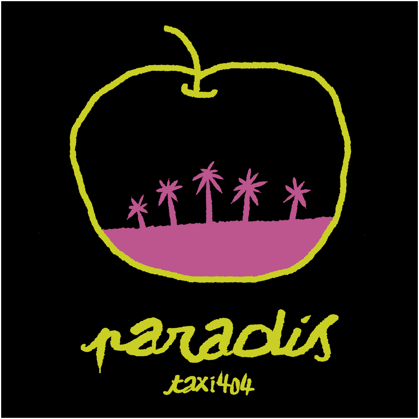 An apple rotting backwards and gold strokes cage a pink oasis. Five coconut trees mock Eden’s order. Taxi 404’s Paradis is synthetic nostalgia; its sweetness is measured in battery bars. The handwritten title is like a note whispering: “Heaven is a glitch in the system.”